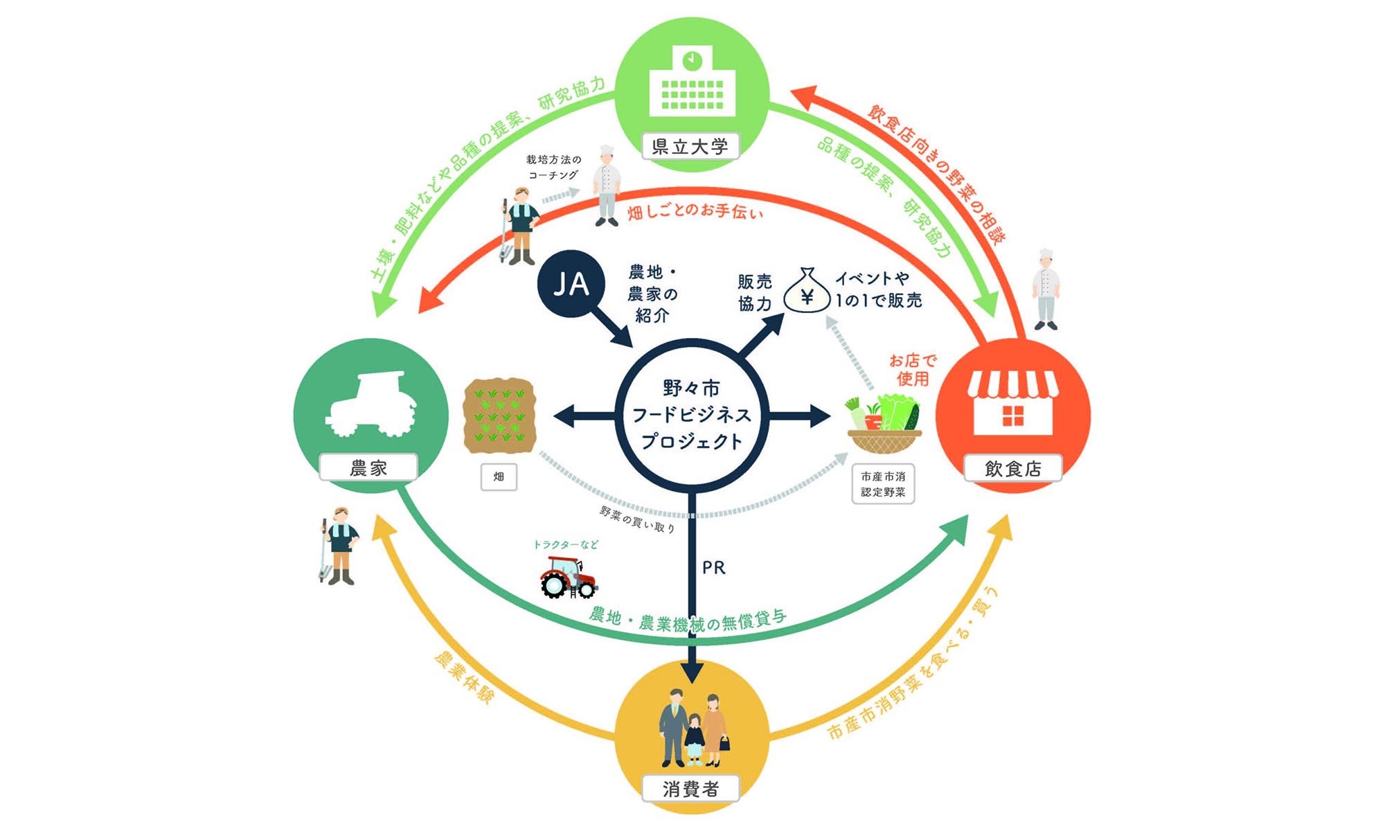 地元の飲食店、農家、消費者、県立大学など、様々な立場の人々がプロジェクトに関わっている