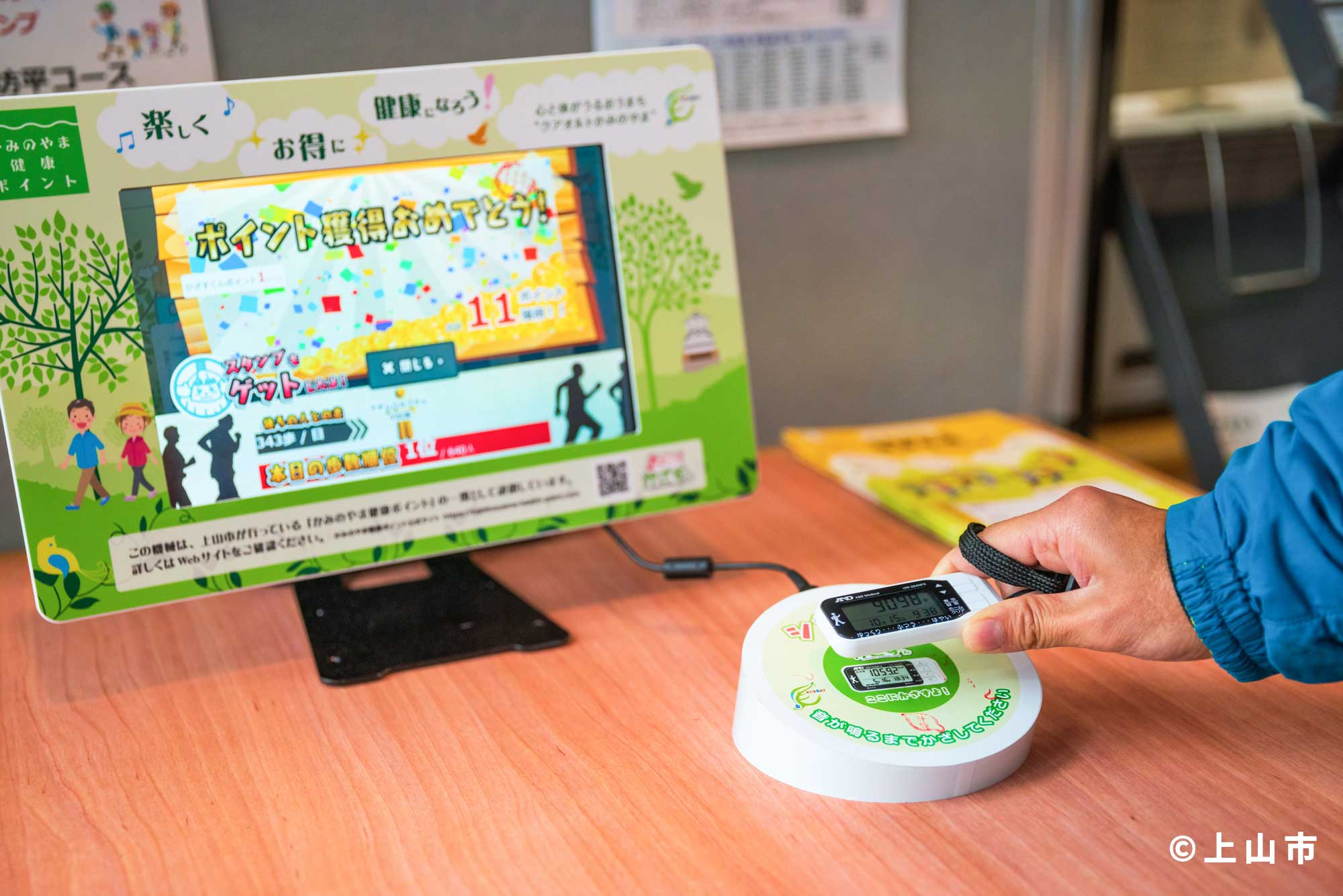 健康ポイント読取端末「あるこう!かざすくん」は市内37か所に設置され、活動量計・アプリをかざすとポイントが貯まる。