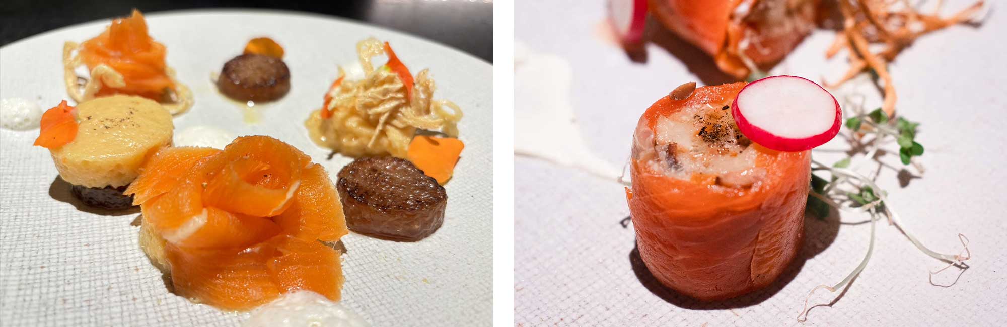 「ヤシオマスのスモークとしもつかれロール仕立て」(右)を提供。しもつかれをフレンチに昇華させる試みにチャレンジしている。