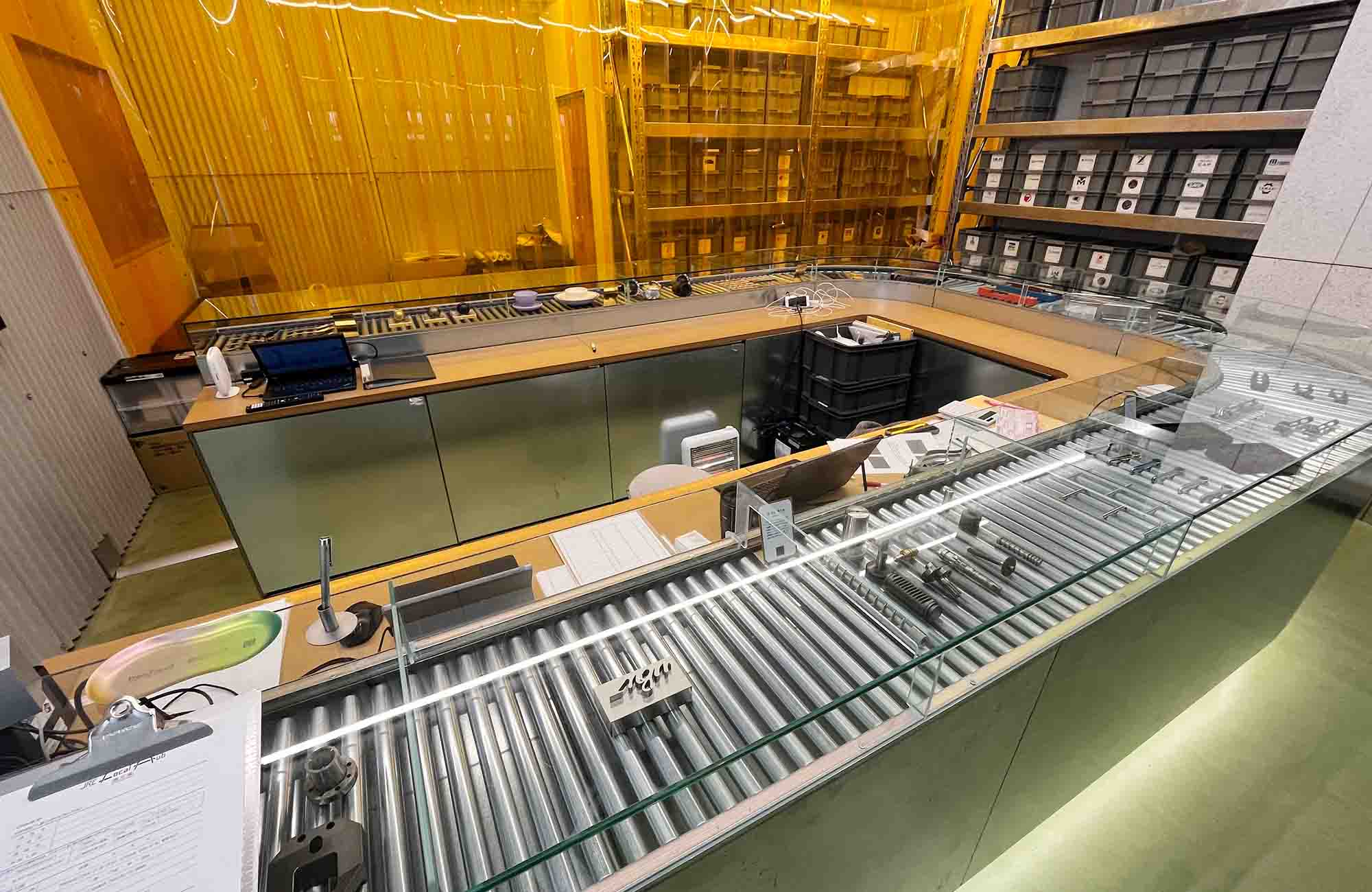 施設内のコンベアには各社のサンプル品が流れ、精巧な加工などを目の前で確かめることができる。