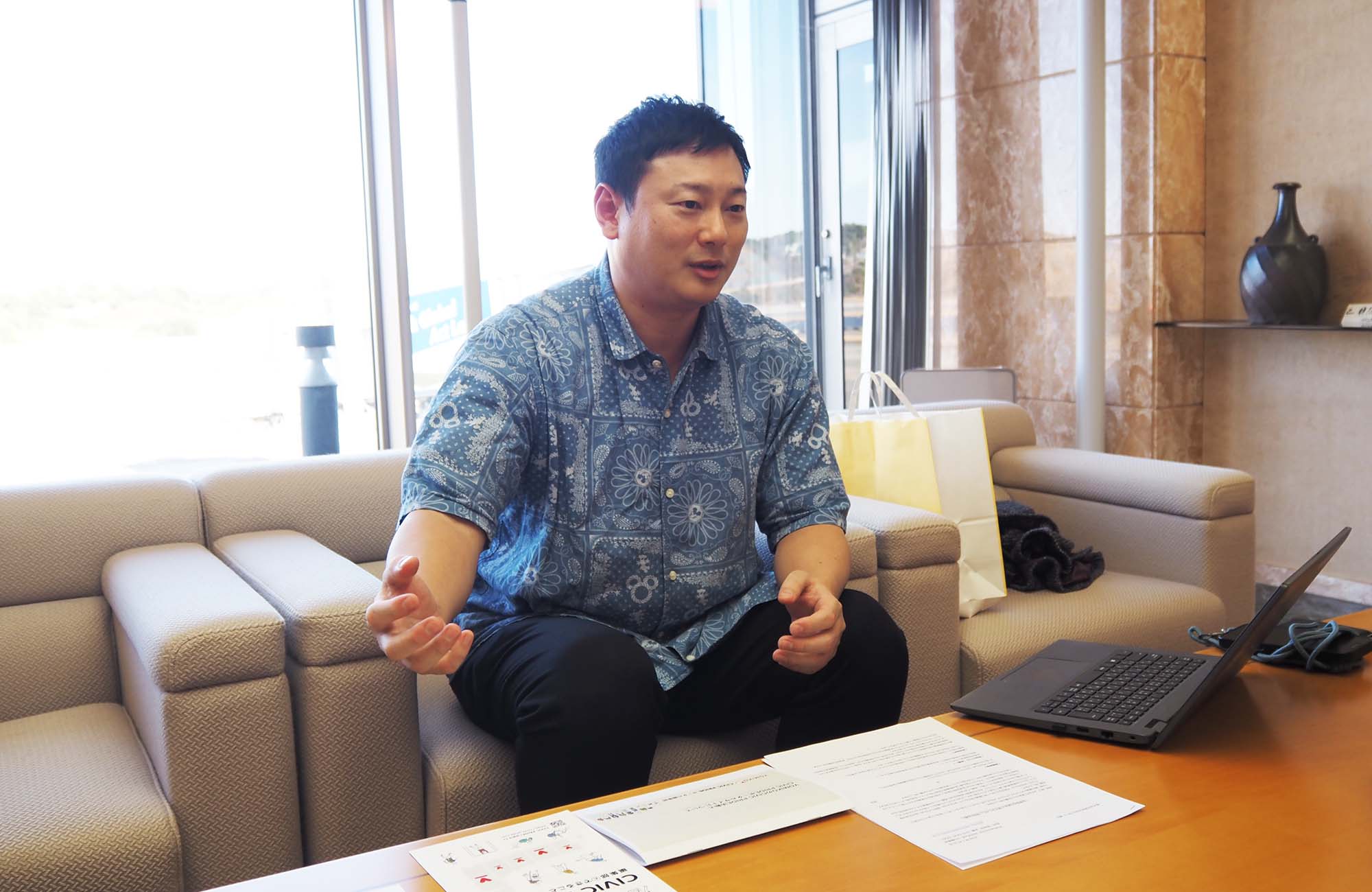 森重さんは白浜町の夏の制服であるアロハシャツを着て、“年間300日の飲み会”を通じて地域の人と信頼関係を築き、新しい地方創生の形を模索し続けている。