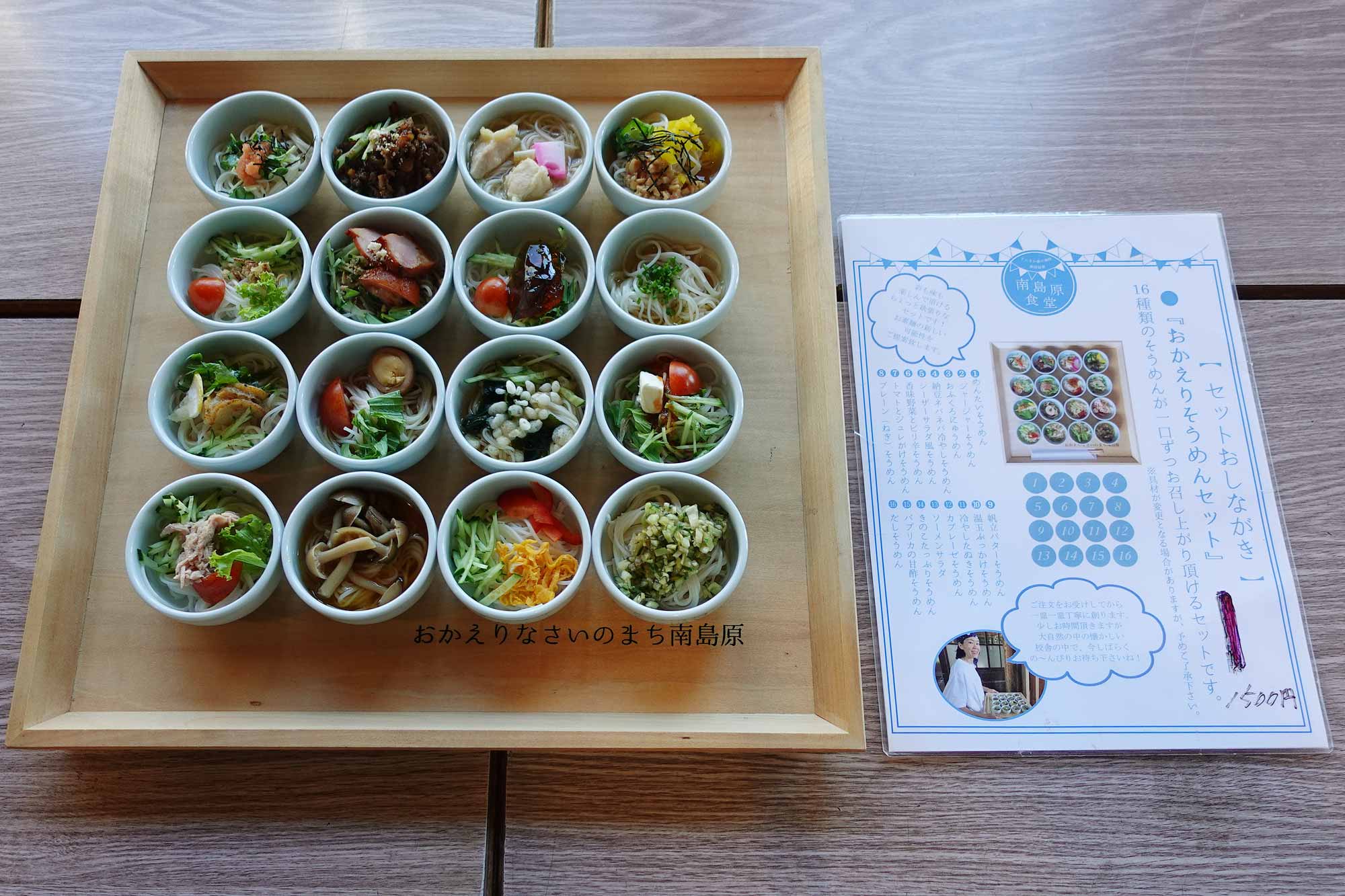 食堂の看板メニューは市の特産品である「島原手延そうめん」をアレンジした「おかえりなさいそうめんセット」。お盆に綺麗に並んだ16種類のそうめんはオリジナルレシピで、使用する食材、出汁、盛り付けのすべてを吉田さんはじめ、集落のお母さんたちが担当している。