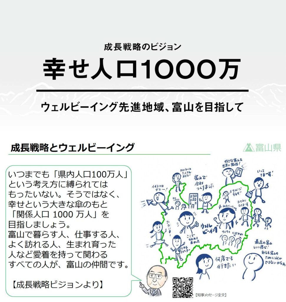 佐渡:契機となったのは、2021年2月に設置された「富山県成長戦略会議」です。富山県は他の地方都市と同様に人口減少や少子高齢化といった課題を抱えており、ピーク時に約112万人いた人口は100万人まで減少。さらにコロナ禍で経済状況も悪化していました。こうした状況を受け、民間出身の新たな知事が就任したタイミングで、県内外の有識者により、将来のビジョンや戦略について約1年にわたって議論が重ねられ、2022年2月にウェルビーイングを中心に据えた戦略が策定されました。