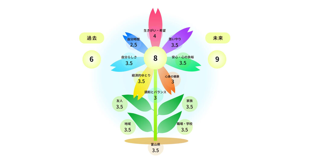 佐渡:意識調査の結果を踏まえ、本県独自の「富山県ウェルビーイング指標」を策定しました。その指標をもとに制作したのが、「あなたのウェルビーイング・チェック!」という、自身のウェルビーイングの状態を測定するツールです。県の公式サイトから誰でも利用でき、総合結果を花の形で表現することで、視覚的にわかりやすく示しています。皆さんに親しみを感じていただけるよう、「花」のモチーフにしました。た。