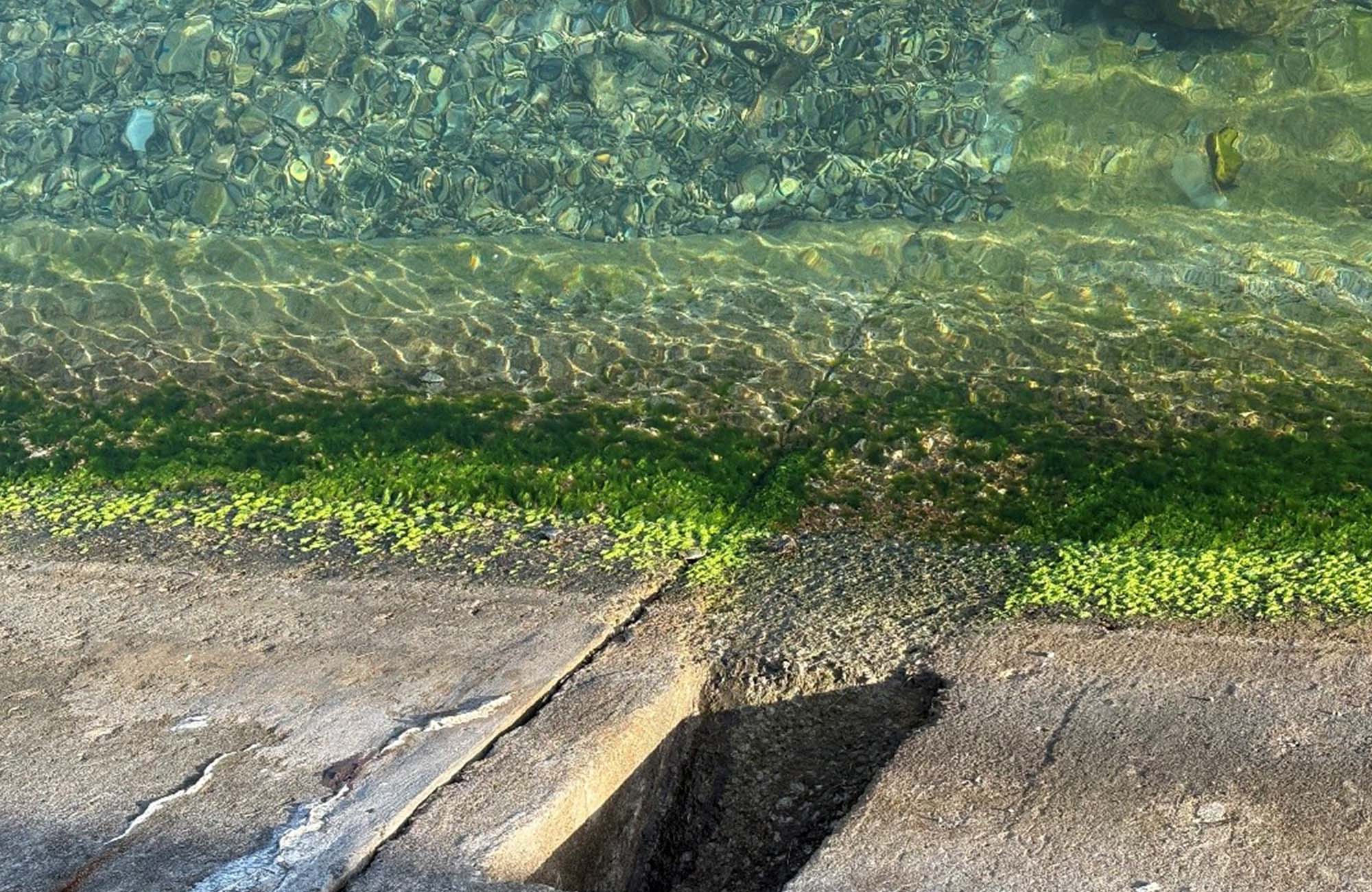 野瀬:この護岸から飼育水を排水しているんですが、よく見てみると排水場所の周りで藻が育ち、カニがそれを食べ、さらに、そのカニを食べに魚が集まってきているんです。今では魚が増えているようで、最近は釣り人の姿も戻り始めています。